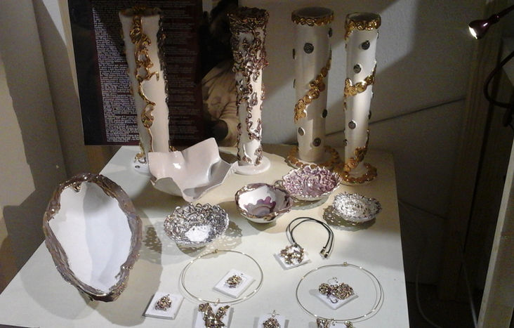 Bijotteria in paper clay e raku decorati a terzo fuoco con oro
